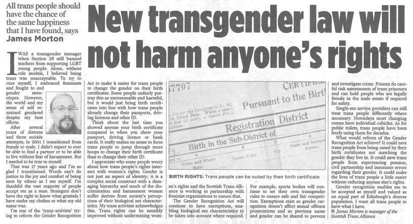 Equality Network / Scottish Transgender Alliance Manager James Morton wrote this piece about gender recognition reform in today’s (13/2/18) Edinburgh News.