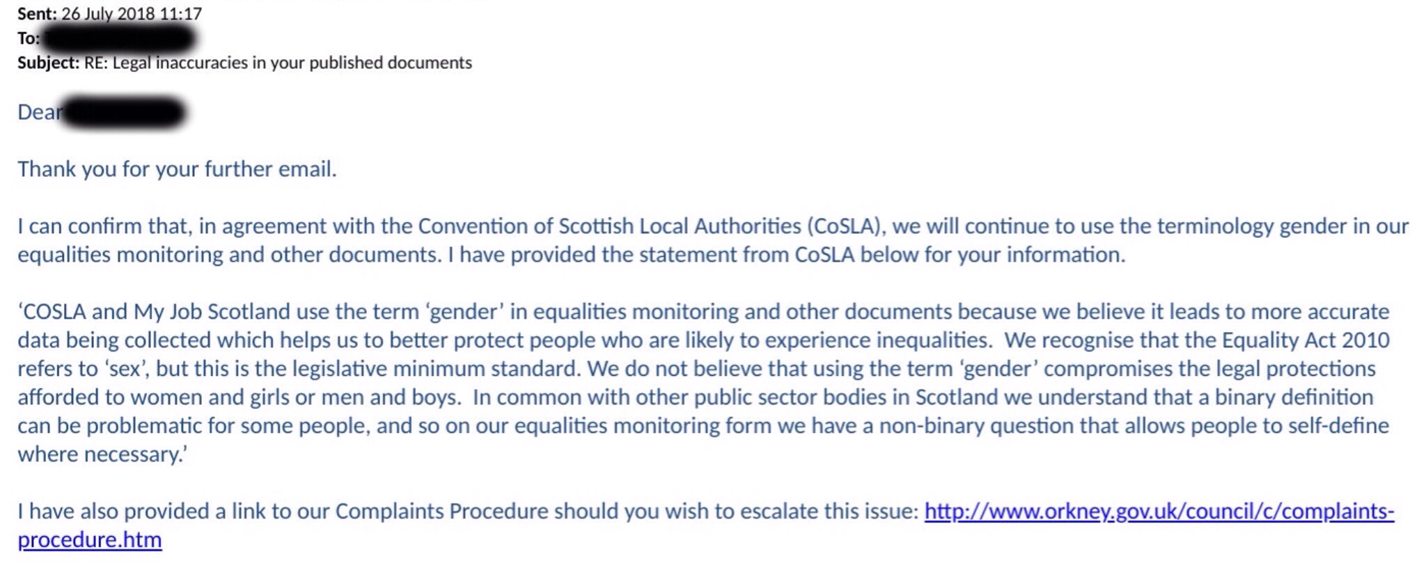 (This response is particularly revealing as it cites Stonewall Scotland as being a reason why they use ‘gender’ instead of ‘sex’. Are our Local Authorities really deferring to a charity rather than what’s written in the legislation?)