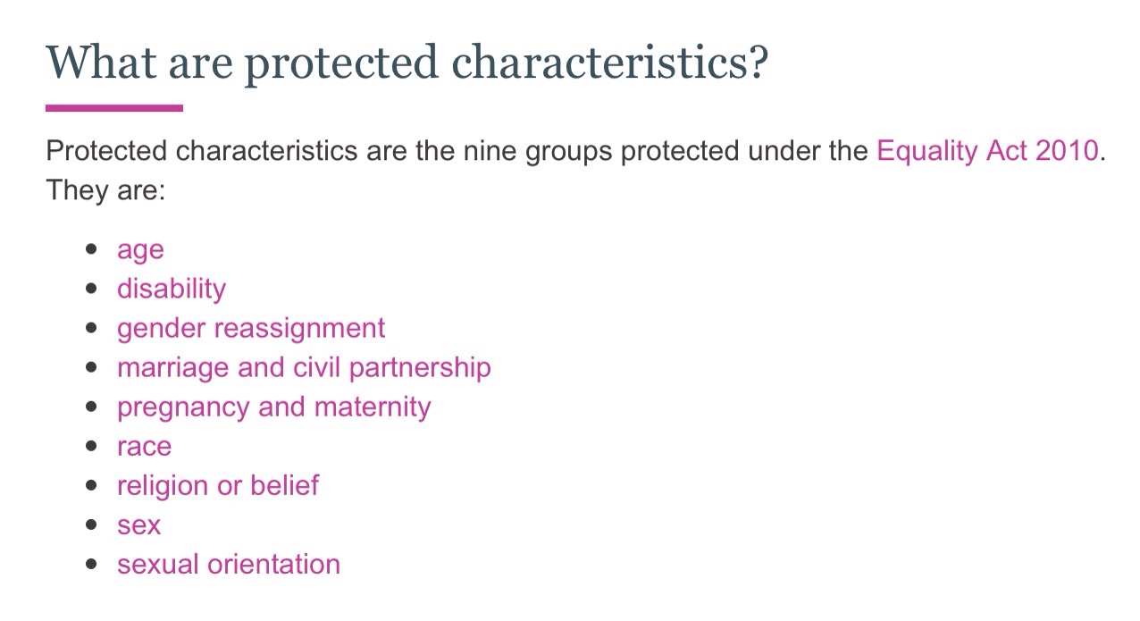 In answering this question I would normally have said yes. It encompasses the range of groups who require additional protection e.g. race, disability, gender reassignment and sex etc. However, that is no longer as straightforward as it should be. Nowadays organisations and public authorities regularly amend the ‘protected characteristics’ by renaming and interpreting them to mean another thing. It’s almost common practice now to see ‘gender’ being used instead of ‘sex’ and ‘gender identity’ rather than ‘gender reassignment’. These changes are not a simple case of just using an alternative word, instead they fundamentally change the level of protection for all those people who fall within either of those groups.