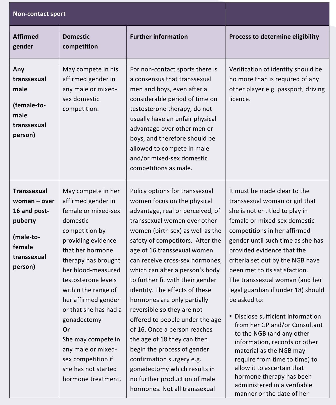 “It must be made clear to the transsexual woman or girl that she is not entitled to play in female or mixed‐sex domestic competitions in her affirmed gender until such time as she has provided evidence that the criteria set out by the NGB have been met to its satisfaction.”
