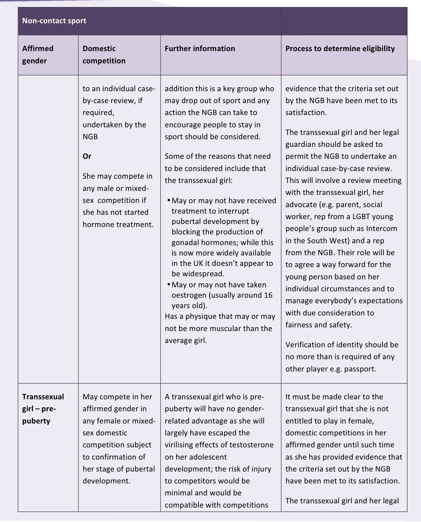 The Sports Council Equality Group which represents the 5 Sports Councils across the UK, including our national agency sportscotland recognise this essential need for equality in sports. They have issued guidance around the eligibility of trans people in sports which is very detailed and breaks down the various different circumstances (i.e. pre/post puberty, hormone treatment etc) and it crucially applies the principles of fair competition and safety of competitors as is required in sport.