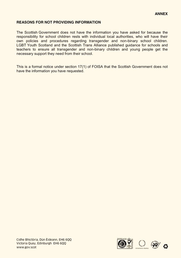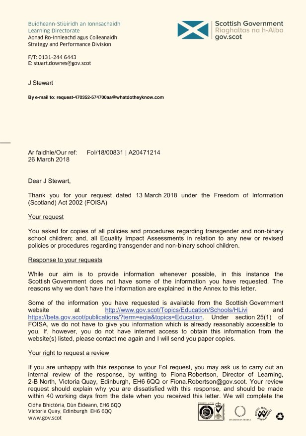 I wrote to many public authorities almost a year ago asking what Impact Assessments were carried out regarding the LGBT Youth Scotland publication ‘Supporting Transgender Young People: Guidance for Schools in Scotland’ LGBT Youth Scotland (2017).